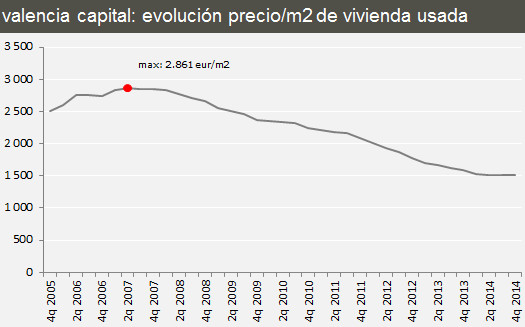 El precio de la vivienda en España acumula un descenso del 37% desde el estallido de la crisis inmobiliaria en 2007, según idealista.com (portal inmobiliario líder en nuestro país). Pero en las principales ciudades la caída ha sido dispar. En Valencia la bajada acumulada es del 47%, mientras que en Barcelona es del 32,6% y en Madrid, del 33,2%. Te mostramos unos gráficos con la evolución del precio en estas tres ciudades