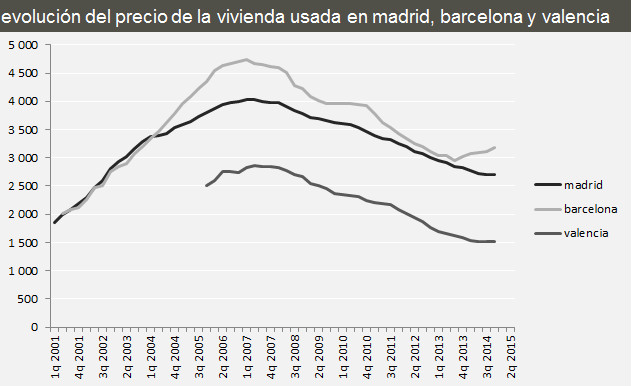 Comparativa de la evolución del precio de la vivienda en Madrid, Barcelona y Valencia desde el año 2000 hasta hoy (gráfico)